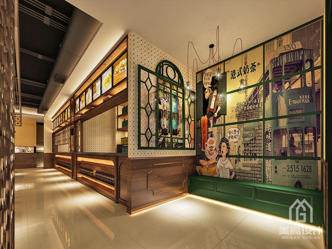 整体门面材质采用香港最有历史特色的仿古马赛克制作,远远看上去就是回忆。里面玄关有个等候区,也是老香港的绿窗和窗外情景,好吧,也是众多网红拍摄的一角,把相机模式调致复古再按哦,里面不管是档口,取餐区,长卡座和颜色都把80年代体现的淋漓尽致,天花采用港式老瓶罐做成的艺术吊灯,给怀旧增加了一份艺术。
