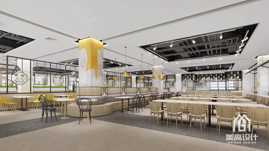 设计说明:本次学生食堂设计,美高设计师融入了食堂文化,这是校园文化的重要组成部分,让食堂文化融入校园文化。经过设计师与业主的反复沟通与交流,从实际需求出发,结合现代简约的表现手法和年轻一代大学生的喜好和特质,给天花造型、墙面隔断与餐桌椅等都做了特别设计。开阔聚会、私密就餐空间等全部安排上,满足不同喜好与需求的学生用餐,非常人性化。