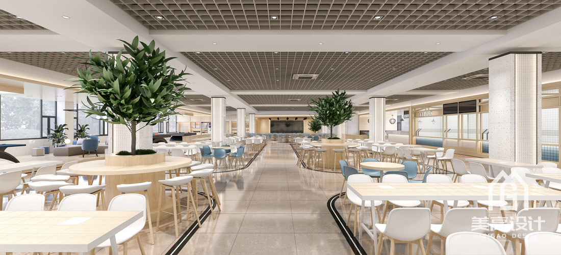 设计说明:本次工厂食堂设计,由于考虑到大部分员工都是在大型工厂重机器中工作,因此设计师采用浅木色和白色为主色调让整体环境更加贴切接近家的感觉,让员工在短短15分钟的就餐时间里整体放松,除了身体感受,心灵一样享受。该项目除了就餐区域外还增加员工活动区域,舞台区域和水吧区域,让餐厅功能整体更加舒适,空间更丰富。